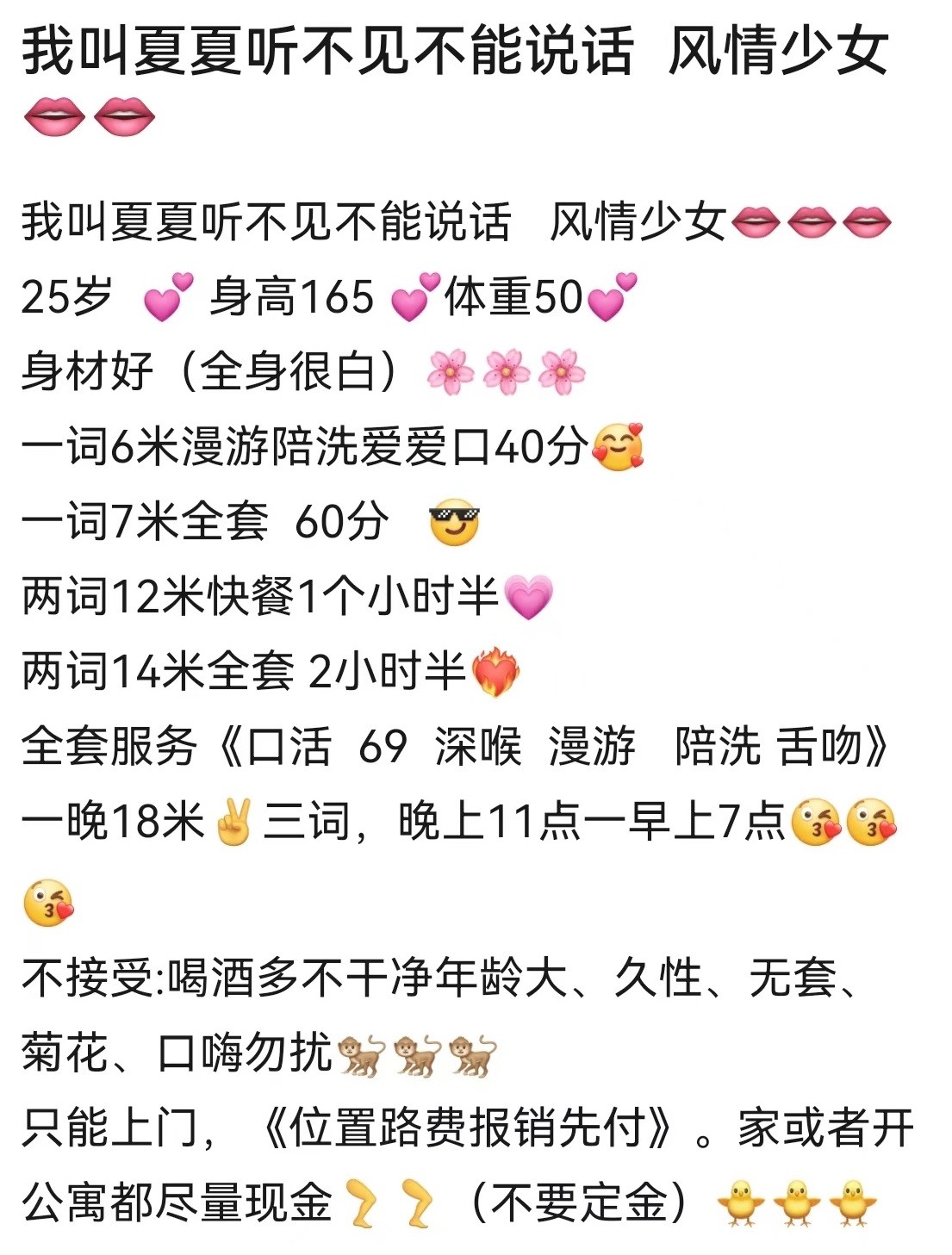 注意:见面之前索取红包、路费、保证金、定金等的个人兼职,以及对服务项目闪烁其词并一直推荐办卡的场所都是骗子的套路